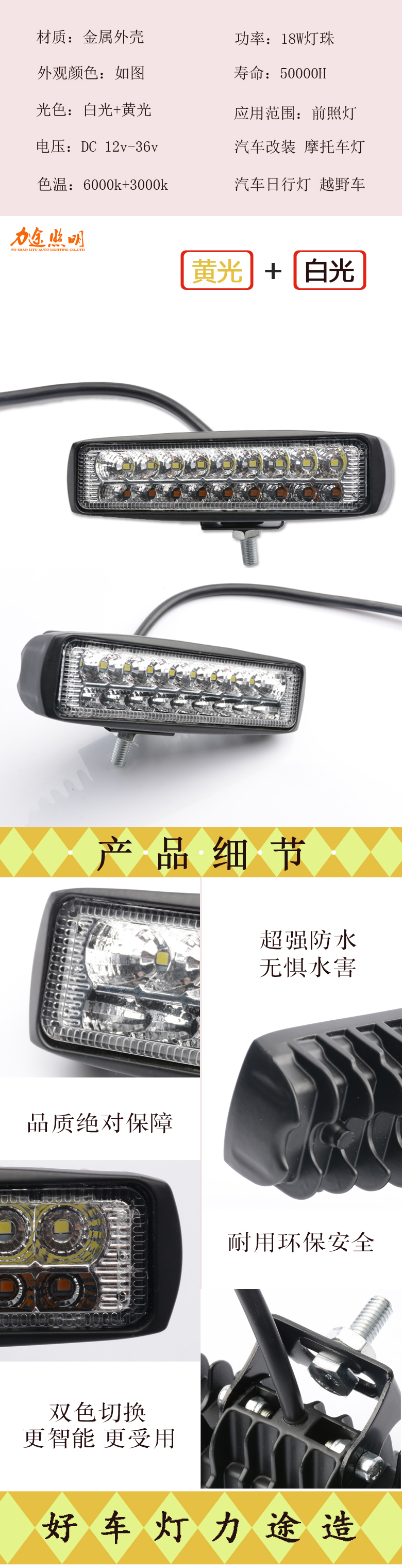 汽车改装高亮LED双排两色带底座18w易安装前大灯