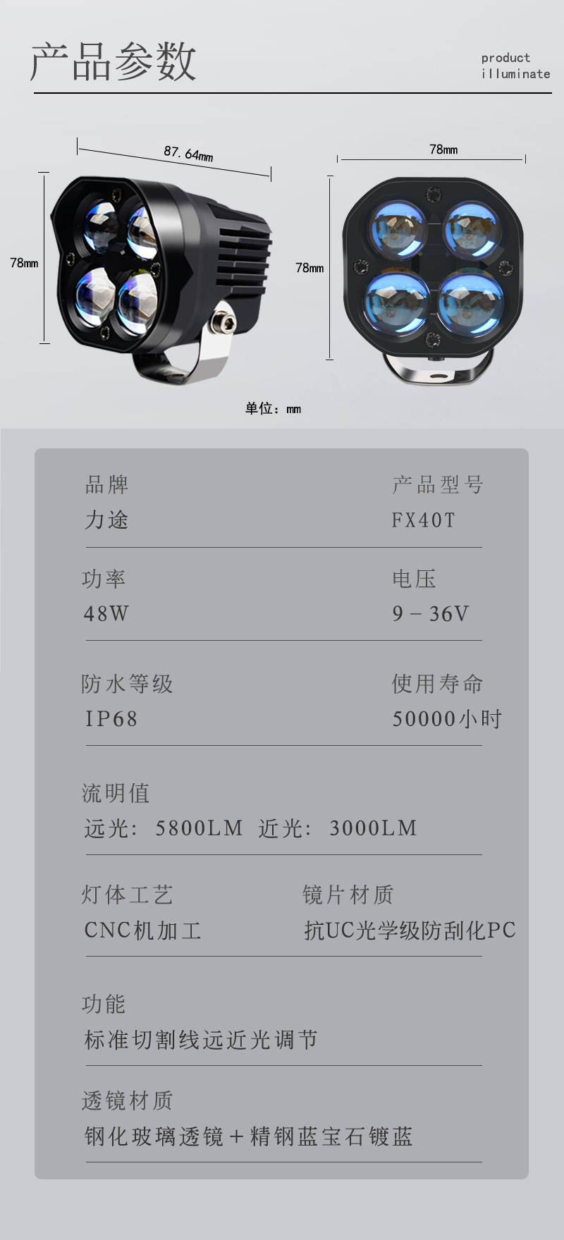 光型:聚光; 流明:5800lm(远光)/3000LM(近光)。
