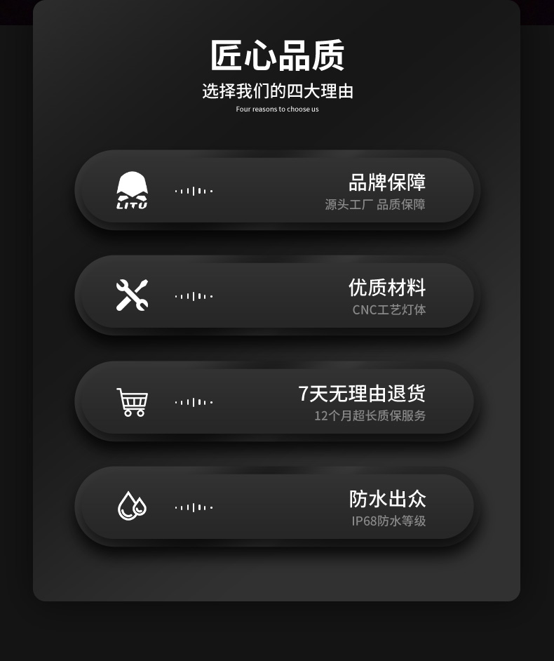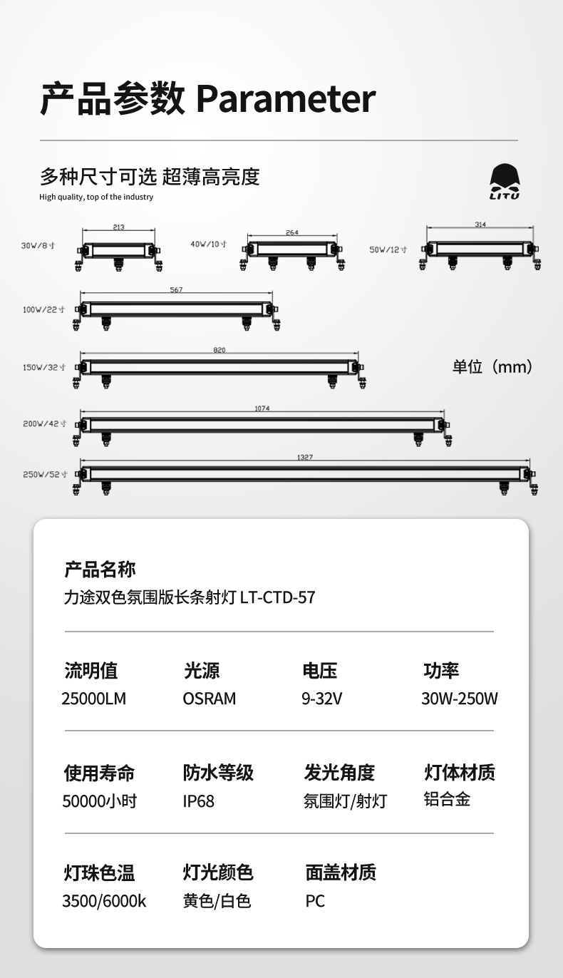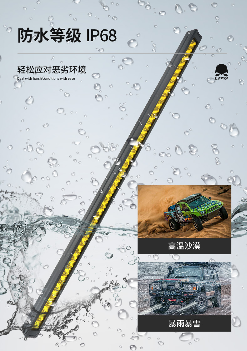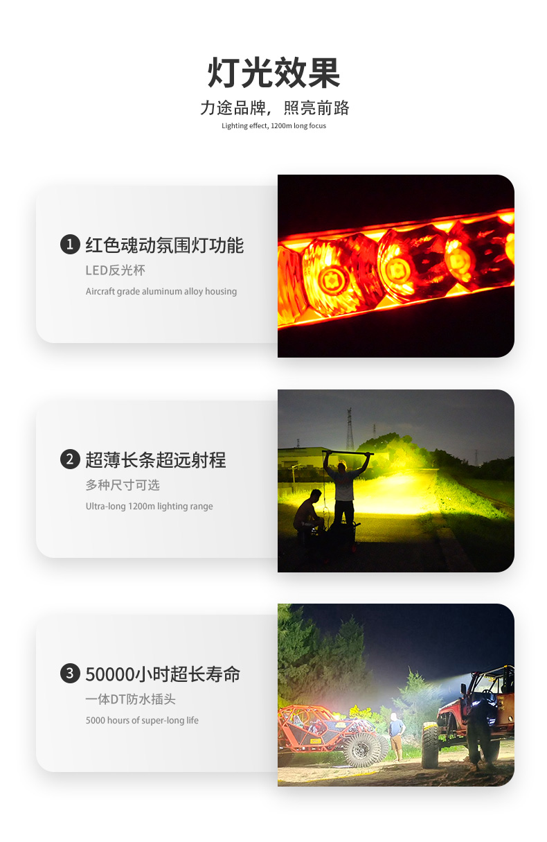 LT-CTD-57 采用流线型单排设计,在提供强大照明的同时,还增强了车辆的美感。配备鲜艳的红色 DRL,确保在黑暗的越野环境中行驶时既安全又时尚。