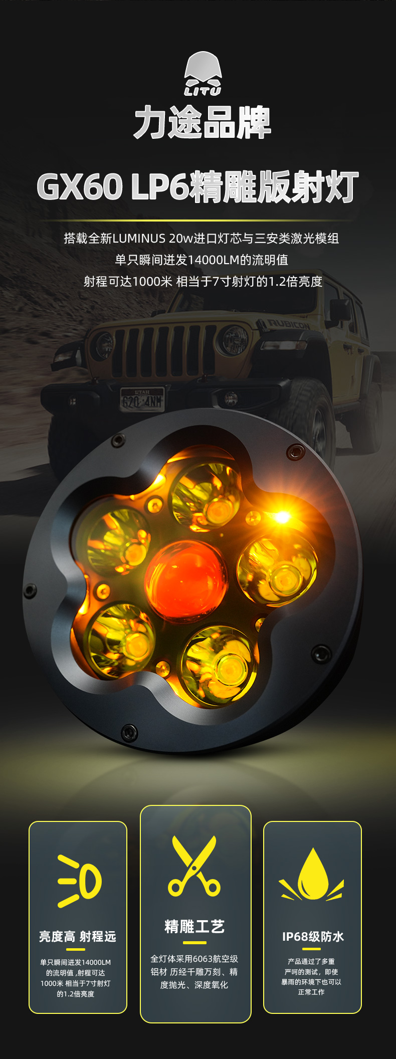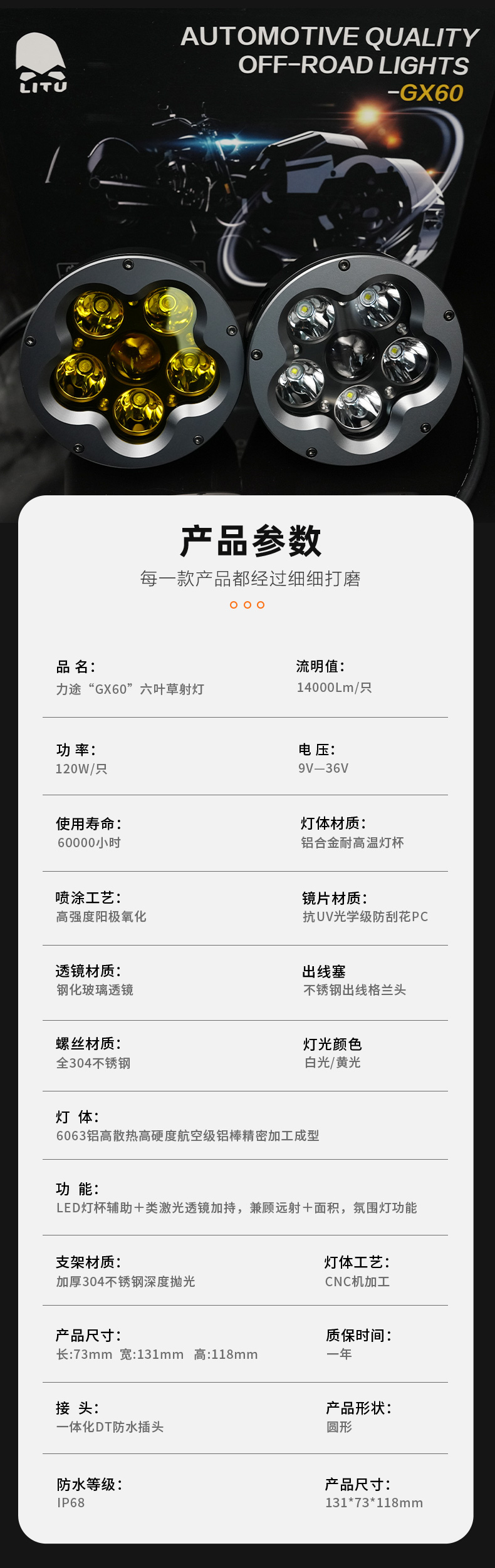 LITU的LT-GX60有卓越的可视性,6000k适合夜间工作,提高可视性,使驾驶人员更安全。 耐冲击PC镜片和铝合金外壳提供了最大的耐久性,以支持恶劣的工作环境。